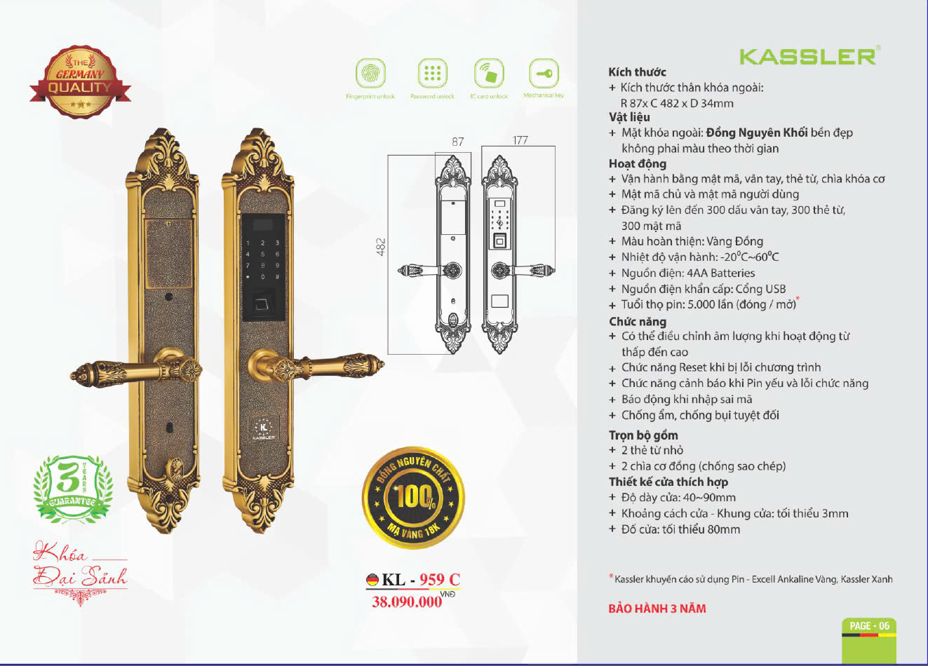Với thiết kế tinh xảo, chất liệu cao cấp và các tính năng bảo mật hiện đại, Kassler KL- 959C không chỉ đảm bảo an ninh mà còn tôn lên vẻ đẹp sang trọng cho không gian sống của bạn.